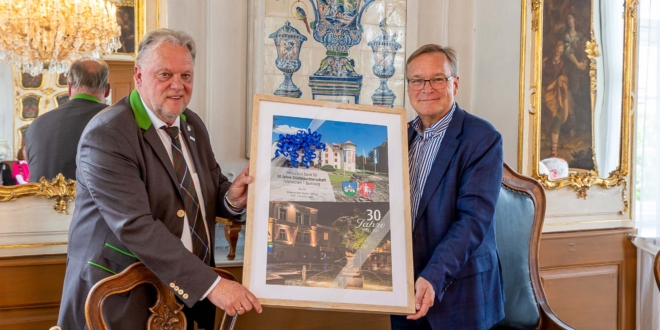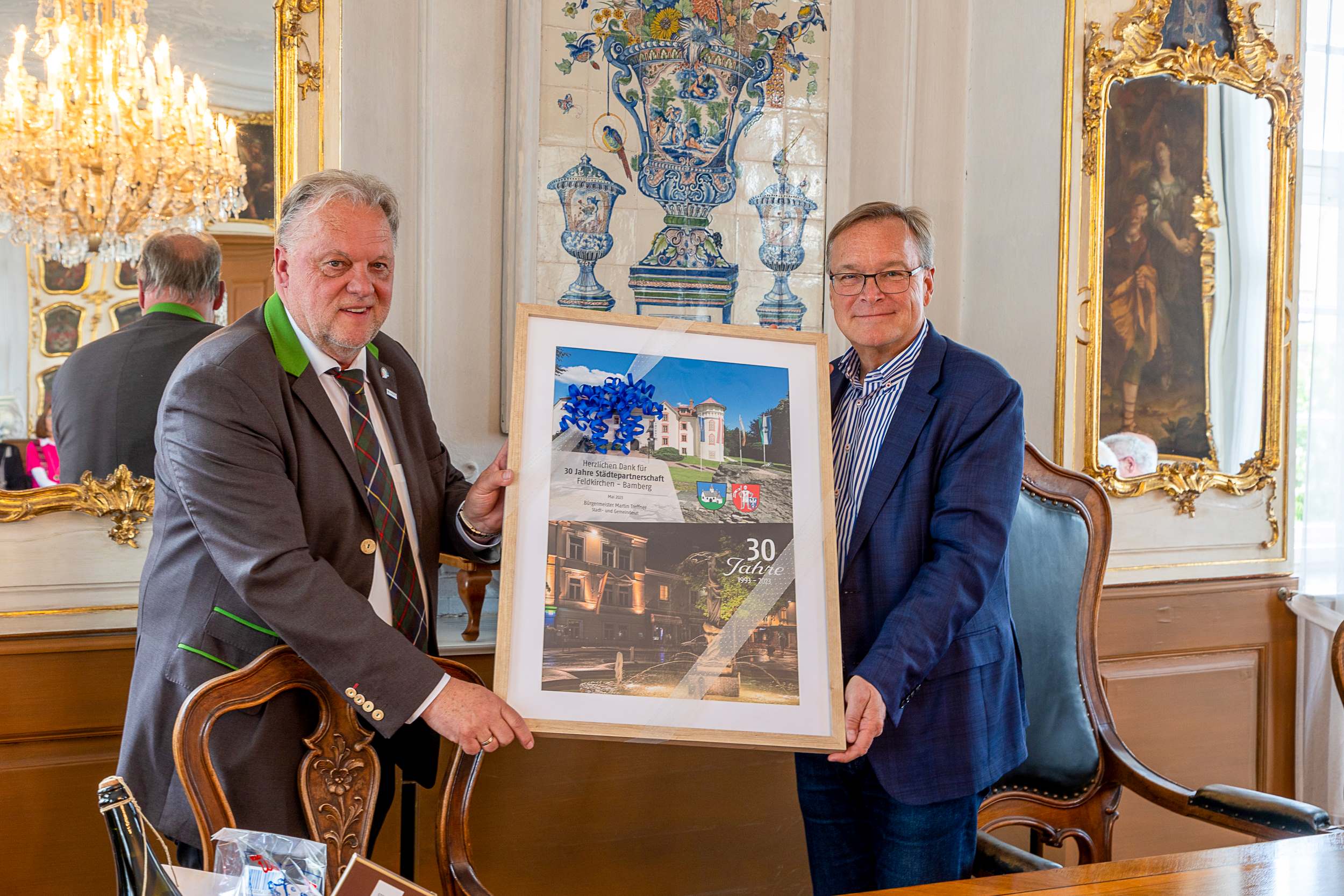 Von 5. bis 7. Mai machte sich eine 7-köpfige Delegation der Stadtgemeinde Feldkirchen mit Bürgermeister Martin Treffner und der Feldkirchner Krippenfreunde mit Obmann Heinz Eichler auf, um anlässlich des 30-jährigen Partnerschaftsjubiläums und des 10. Weltkulturerbelaufs, der Partnerstadt Bamberg einen Besuch abzustatten. Bambergs Oberbürgermeister Andreas Starke bekam von Tiebelstadt Bürgermeister Martin Treffner als Zeichen des Dankes und der guten Zusammenarbeit eine Urkunde mit Bildern von Feldkirchen überreicht (im Bild). Im Bamberger Kongresshotel wurde die Städtepartnerschaft gemeinsam gefeiert. Es gab auch noch einen Empfang anlässlich des 30-jährigen Partnerschaftsjubiläums im alten Brückenrathaus.