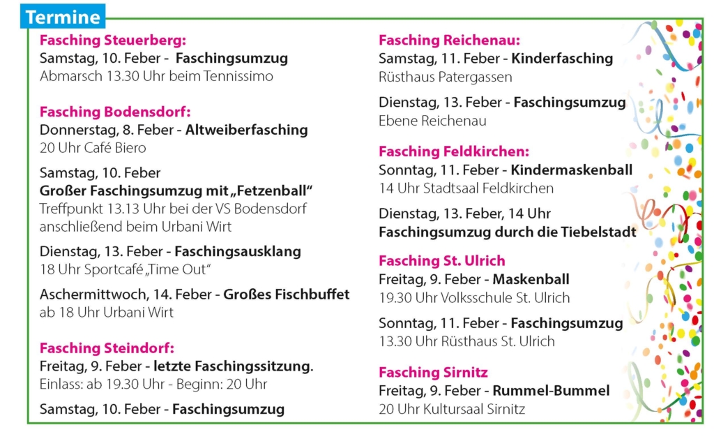 Die restlos ausverkauften Faschingssitzungen im Bezirk sind so gut wie vorbei, doch der Fasching noch lange nicht. So wird in Bodensdorf noch ordentlich gefeiert, z. B. beim großen Faschingsumzug mit anschließendem Fetzenball beim Urbani Wirt, beim Altweiberfasching im Café Biero oder beim Faschingsausklang im Sportcafé „Time Out“. Doch damit nicht genug, gibt‘s für alle Faschings-Narren noch die Faschings-Umzüge in den einzelnen Gemeinden sowie Kindermaskenbälle, Maskenbälle, Faschingsausklänge, Rummel-Bummel und vieles mehr.