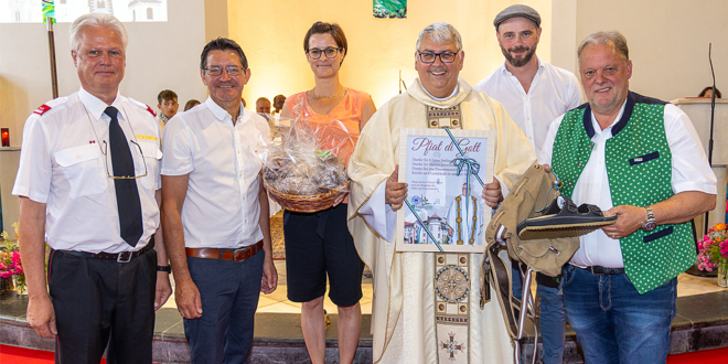 Acht Jahre lang war Bruder Wolfgang Gracher als Stadtpfarrer von Feldkirchen unterwegs und betreute acht Pfarren. „Mit großer Wehmut und Dankbarkeit und einer neuen Aufgabe ziehe ich weiter“, so der sympathische Pfarrer, der vielen ans Herz gewachsen ist. Gracher legte am 31. August sein Amt in Feldkirchen nieder und ist jetzt Pfarrer vom Pfarrverband Donaustadt Mitte. „Ich werde viele Menschen hier in Feldkirchen vermissen, wie auch das Miteinander mit Angestellten und dem Jugendzentrum, die schönen Kirchen, die Seen – und das schöne Leben hier“, meint Bruder Wolfgang wehmütig. Im Rahmen des Dankgottesdienstes im Juni fand schon eine kleine Verabschiedung statt. Es gab auch nette Geschenke. So übergab ihm sein Freund, Bgm. Martin Treffner, ein paar neue Pantoffeln und ein gerahmtes „Pfiat di‘ Gott“ Bild. Die Vizebgm. Isabella Breiml und Siegfried Huber überreichten im Namen der Stadtgemeinde Feldkirchen einen Geschenk-Korb, der Pfarrverband hielt das Radl des Pfarrers als Andenken auf Leinwand fest und die FF Glanegg überreichte einen Jausenkorb. Pfarrer Dieudonné Mavudila-Bunda trat mit 1. September Grachers Nachfolge an.