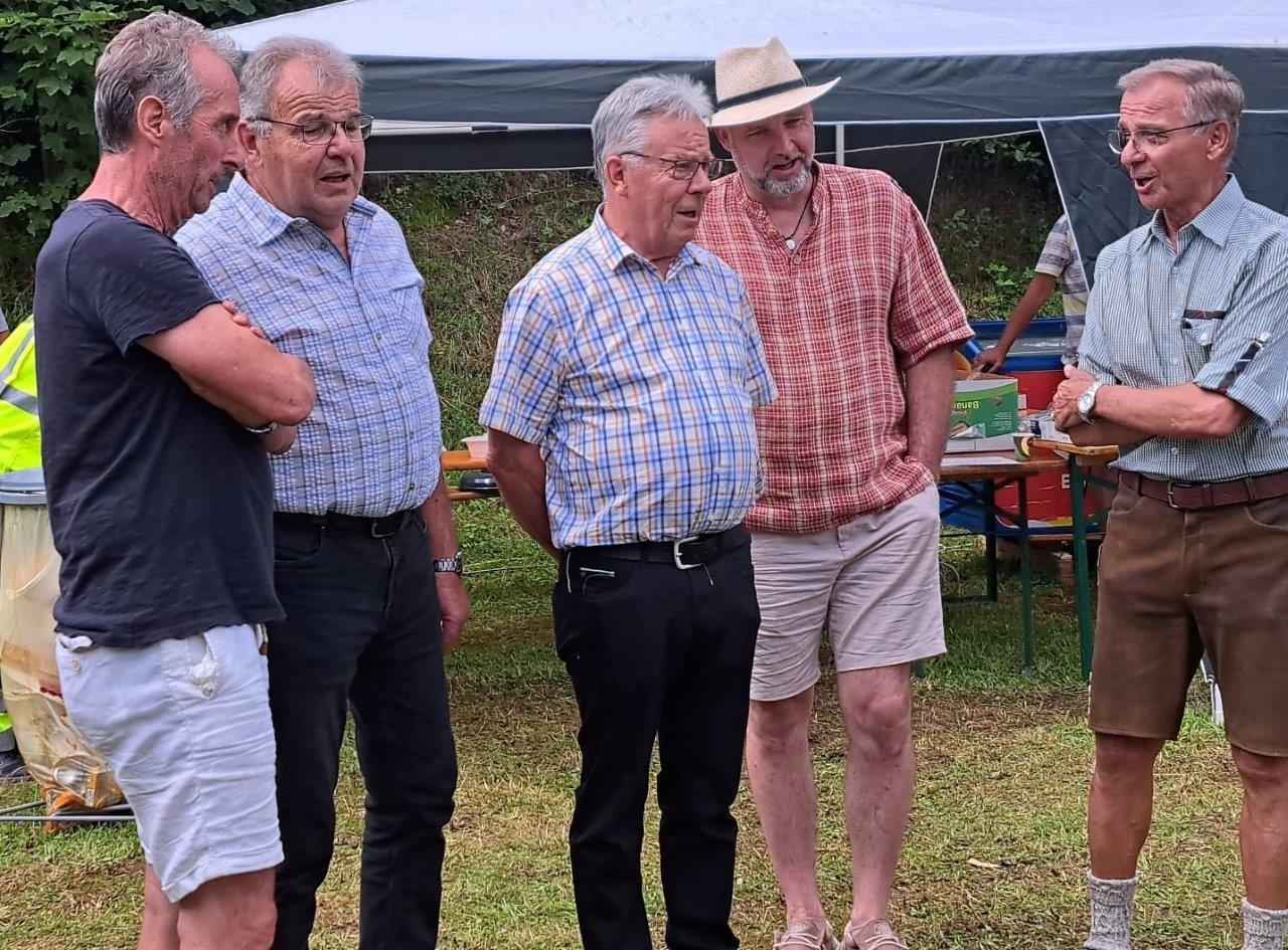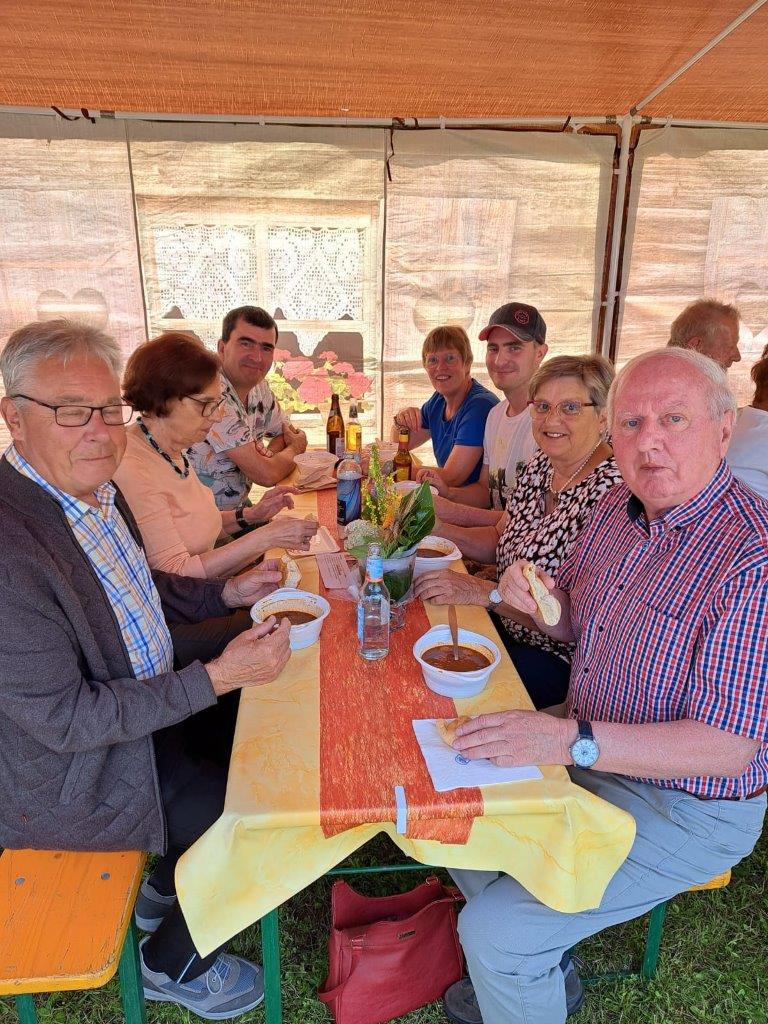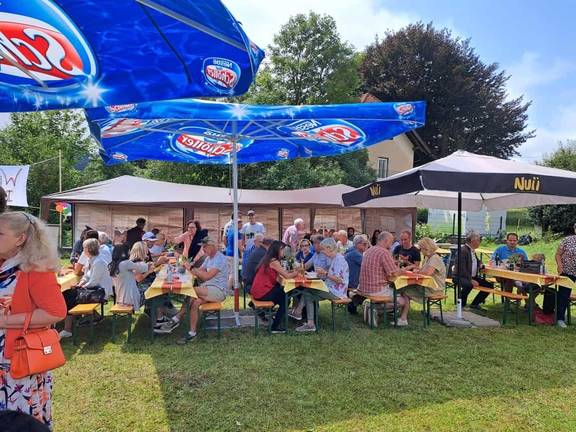 Alles war für das große Fest am Sonntag, den 23. Juli 2023 schon vorbereitet. Doch leider zerstörte ein Unwetter einige Zelte. „Noch am Abend sind alle gekommen, um den Platz für den nächsten Tag wieder perfekt herzurichten. Das ist eben gelebte Nachbarschaft. Viele sind dabei, wenn es gilt ein gemeinsames Projekt umzusetzen. Und dies, obwohl einige sich noch nie persönlich kennengelernt haben. Damit erfüllte sich bereits der Sinn dieses Dorftreffens“, betont Stiegelschneider Loise und erzählt weiter: „Und dann das Fest. Nahezu aus allen Häusern sind sie gekommen. Auch Weggeheiratete sind gekommen und haben sich mit den „Zugezogenen“ und der „Stammbevölkerung“ unterhalten. So manche Erinnerung wurde aufgefrischt und Freundschaften sind neu entstanden.“