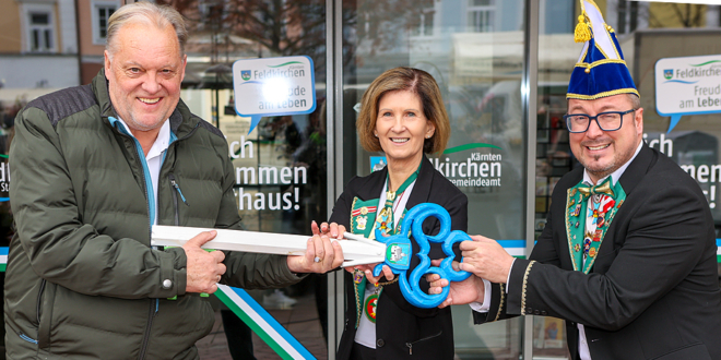 Bei Live-Musik der „Faschingslader“ und bester Stimmung durfte Faschingspräsident Peter Kowal auch wieder den Stadtschlüssel aus den Händen von Bürgermeister Martin Treffner „entreißen“. Adabei: die Vizebgm. Siegfried Huber und Christian Petautschnig sowie die Stadträte Helmut Kraßnig und Christoph Gräfling und Landtagsabgeordneter KO Herwig Seiser. Die FF Waiern erhielt vom Faschingsklub finanzielle Unterstützung für neues Türöffnungswerkzeug. Kommandant Thomas Puschitz und Stellvertreter Sieghard Natmeßnig bedankten sich herzlich. Eine Abordnung zog danach durch die Innenstadt und lud zu den Jubiläumssitzungen ein. Karten sollten frühzeitig gesichert werden – die Nachfrage ist hoch. GLUCK GLUCK – olé!
