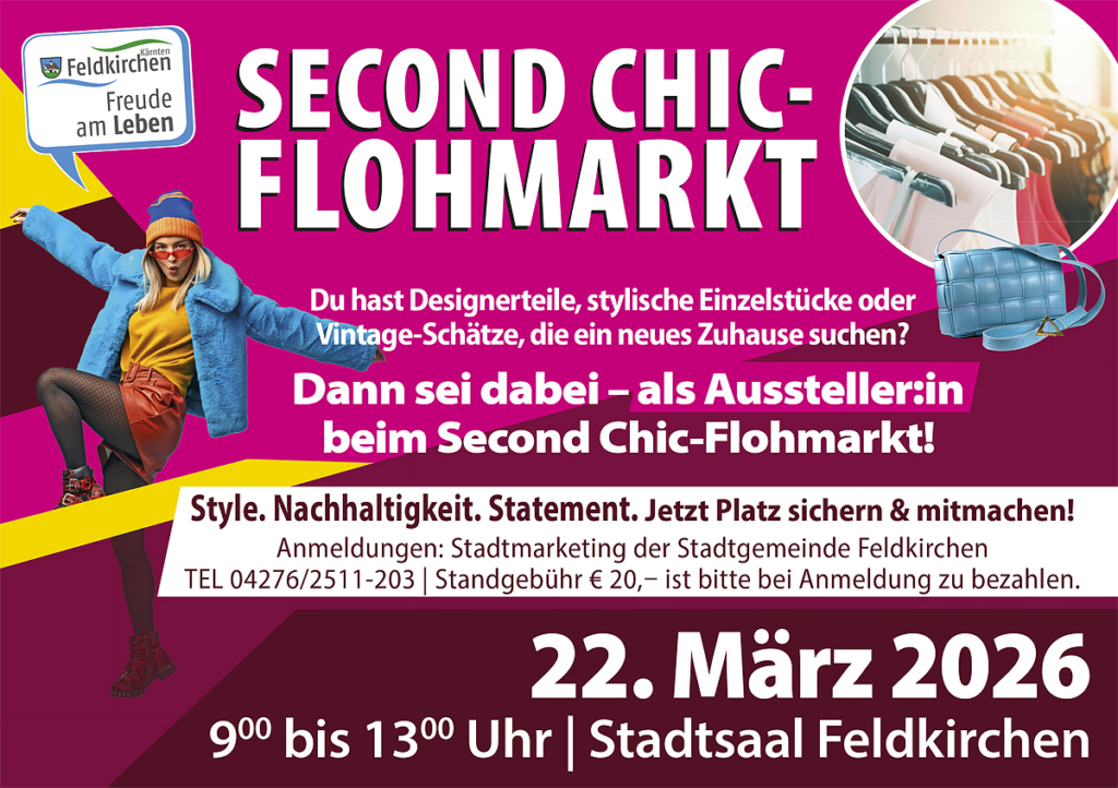 Neu im Programm ist der „Second Chic“-Flohmarkt am Sonntag, dem 22. März, von 9 bis 13 Uhr. Dabei dreht sich alles um Mode für Erwachsene und Nachhaltigkeit. Ob Designerteile, besondere Einzelstücke oder Vintage-Schätze – gegen eine Standgebühr von 20 Euro kann jede und jeder als Aussteller:in teilnehmen. Übrigens: Die 4. Feldkirchner Baby-, Kinder- & Jugendbörse (Flohmarkt) geht am Sonntag, den 1. März, von 9-13 Uhr im Stadtsaal über die Bühne.