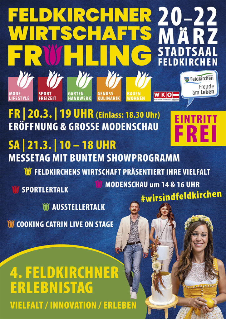 Nach der erfolgreichen Premiere im Vorjahr geht der „Feldkirchner Wirtschaftsfrühling“, organisiert von der Stadtgemeinde Feldkirchen und der WK Feldkirchen, heuer in die nächste Runde. Von Freitag, 20. bis Sonntag, 22. März, verwandelt sich der Stadtsaal wieder in eine Bühne für die Vielfalt der regionalen Wirtschaft – ganz nach dem Motto: WIR SIND FELDKIRCHEN!