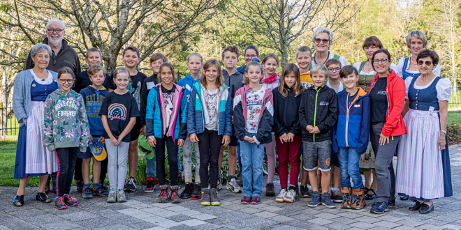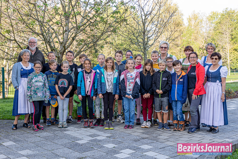 Die Goldhaubenfrauen Feldkirchen mit Obfrau Grete Puff organisierten im Zuge des „Jahres der Volkskultur“ einen „Wald- und Wildtag“ für die Schüler:innen der 4. Klasse Volksschule in St. Martin.