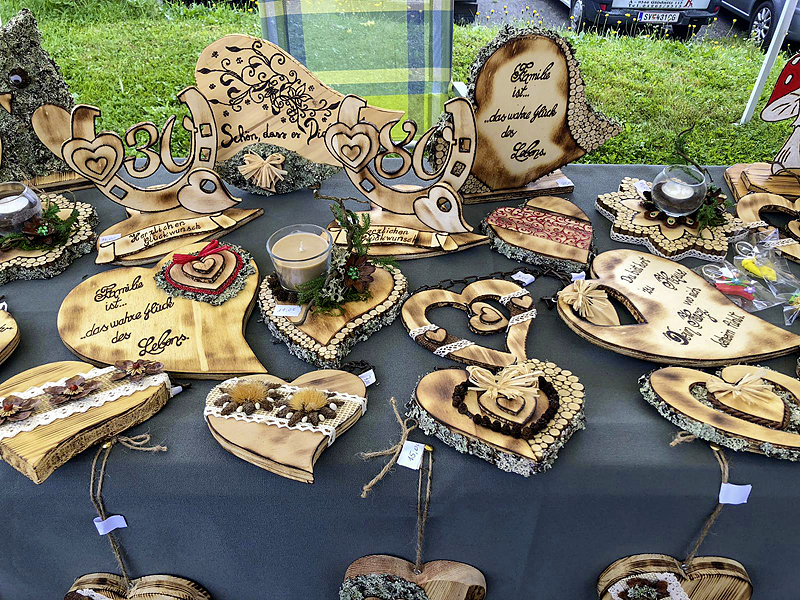 Wie ein Schuster arbeitet, konnte man bei der Herzlhütte bestaunen. Auch Zirbenholz-Kunst gab es zu sehen. Bei der Hiasl Zirbenhütte zeigte Besenbinder Hans sein können. Korbflechter waren beim JUFA Hotel am werkeln. Auch Zirbenholzbrettchen konnte man gestalten. Bäuerliches Handwerk und Kirchtagssuppe gab‘s bei der Wugganig Hütte. Mit Lamaprodukten lockte der Almengasthof Stoichart. Kinder konnten dort auch Keramiken machen. Wie ein Holzschnitzer arbeitet sah man im Gasthaus Treffpunkt. Von dort aus konnte man auch eine Pferdekutschenfahrt unternehmen. Hausgemachte Liköre fand man u.a. im MiniMarkt. Beim Gasthaus Meili-Alm wurden Salben hergestellt und Herzerl aus Holz sowie Krampusmasken geschnitzt. Ponyreiten gab‘s beim Kinderbauernhof Anderele.
