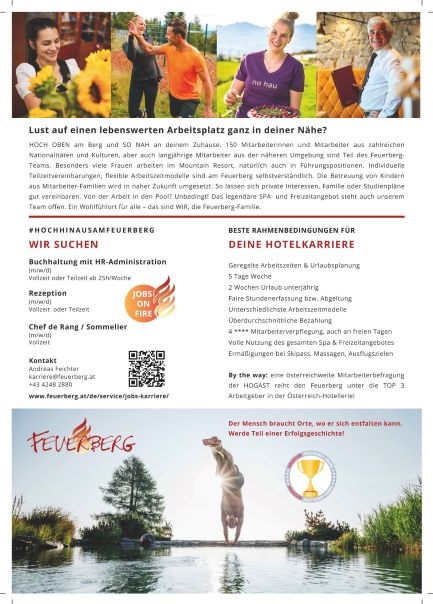 Arbeiten, dort wo andere Urlaub machen! Wer träumt nicht davon? Diese Chance bietet das Mountain Resort Feuerberg mit einer Reihe interessanter Job-Angebote (Details siehe nebenstehende Seite). Groß geschrieben wird am Feuerberg auch zeitliche Flexibilität: „Wir bieten sämtliche Arbeitszeitmodelle – je nach Lebenslage wie berufsbegleitend, Teilzeit für Mütter, 4-Tage Woche, freie Tage am Block usw. Hier kommen wir unserem Personal wirklich sehr entgegen“, betont Christine Felsberger, Personalleiterin Mountain Resort Feuerberg.