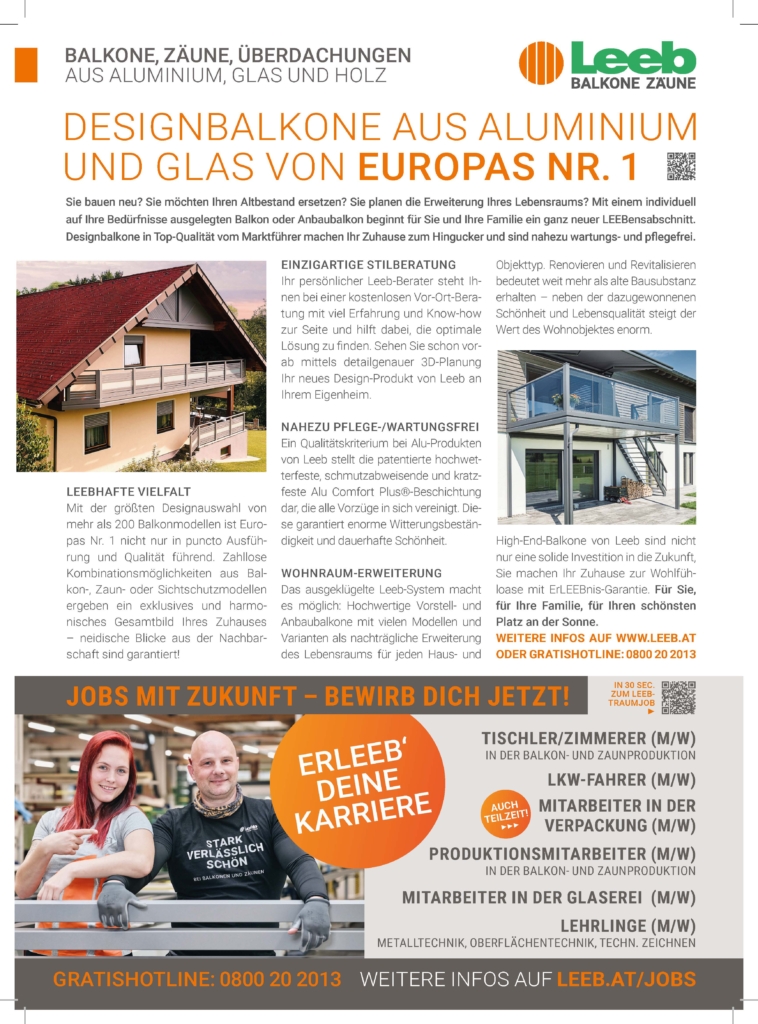 Auf eine ausgeglichene Work-Life-Balance setzt auch Europas Nr. 1 in Sachen Balkone, Zäune & Überdachungen aus Alu, Glas & Holz! Leeb Balkone in Gnesau bietet für viele Tätigkeiten flexible Teilzeitmodelle mit vormittags vier bis fünf Stunden Arbeitszeit bei lukrativer Entlohnung an. Damit sich Job, Familie und Freizeit ideal kombinieren lassen. Auch Quereinsteiger:innen sind willkommen!