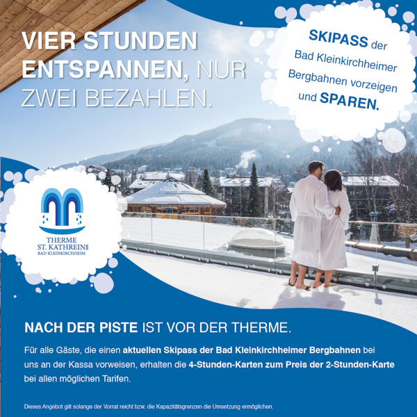 Skipass der Bad Kleinkirchheimer Bergbahnen an der Kassa der Therme zeigen und 4 Stunden zum Preis von 2 genießen.
