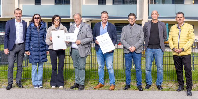 Mitte Oktober wurde das Kärntner Siedlungswerk (KSW) in Villach für vier innovative Wohnbauprojekte mit dem klimaaktiv Gebäudestandard Silber ausgezeichnet, verliehen vom Bundesministerium für Wirtschaft, Energie & Tourismus. Unter den prämierten Projekten ist auch die Wohnanlage Almweg in Feldkirchen. Natürlich gratulierten auch die Vertreter:innen der Stadtgemeinde Feldkirchen – darunter Bürgermeister Martin Treffner, Amtsleiterin Silvia Schwarz, Stadträtin Andrea Pecile und Abteilungsleiter Peter Schiestl-Jamy – dem KSW-Team mit Geschäftsführer Christian Piber, Prokuristen und Baumanager Gottfried Ramsbacher, Energieberater Arnold Schnitzer und Architekt Robert Heiglauer direkt vor Ort in der Wohnanlage Almweg.
