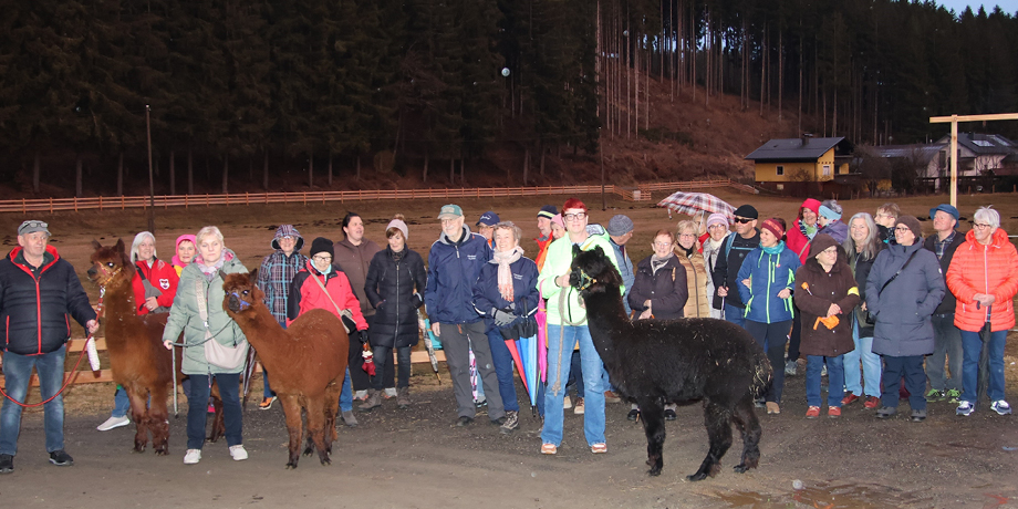 Die PVÖ-Ortsgruppe Lindl-Laboisen rund um Obmann Franz Skumac lud zur Mondscheinwanderung mit Alpakas ein. Wanderführer Sigi Preiml hatte alles bestens organisiert. Startpunkt war der Lamahof Marbauer in Kerschdorf. Dort lernten die Teilnehmer ihre flauschigen Begleiter Hera, Sven, Loki, Loui, Olaf und Jakob kennen. Trotz leichtem Regen wurde die Tour zu einem besonderen Naturerlebnis. Schon bald fanden die Pensionist:innen den richtigen Draht zu den Tieren und merkten schnell, was jedes Alpaka braucht, damit Mensch und Tier harmonisch unterwegs sind. So wurde die Wanderung Schritt für Schritt zu einem ruhigen, fast meditativen Erlebnis. Zum gemütlichen Ausklang kehrte die Gruppe im Gasthaus Hoisbauer ein und ließ sich knusprige Backhendln schmecken. Auf der Heimfahrt verzog sich schließlich der Regen, und der Vollmond setzte dem gelungenen Abend noch die Krone auf.