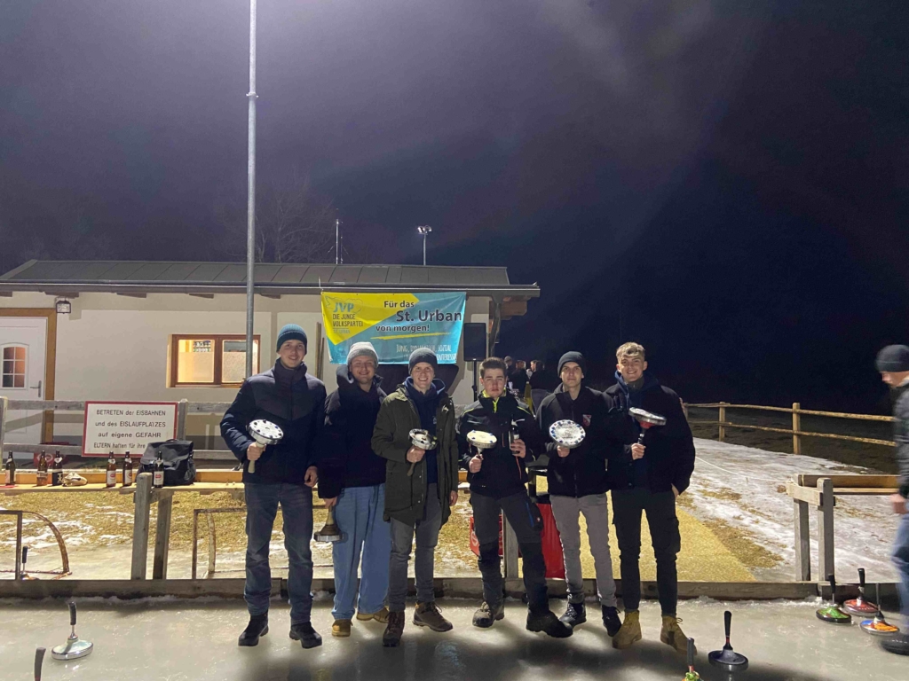 Die JVP St. Urban mit Obmann GV Maximilian Kogler lud am Freitag, den 2. Feber zum Kärntnerstock Nachtturnier ein. Schauplatz war die Eissportanlage in Rogg. Insgesamt 17 – höchst sportlich besetzte – Teams mit jeweils vier Personen rangen dabei um den begehrten Sieg. Diesen trug dann, nach einem heißen Battle, das Team mit Doppel-Weltmeister Alfons Marktl, Europameister Andreas Schurian, Sabine Kraschl und Benjamin Fillafer davon. Als Preise winkten Bauernkörbe randvoll mit regionalen Köstlichkeiten sowie verschiedensten Gutscheinen aus der Region. Am Siegerfoto von links: Obmann GV Maximilian Kogler, Benjamin Fillafer, Andreas Schurian, Sabine Kraschl, Alfons Marktl, Obmann-Stv. Alexander Sonvilla und GR Helmut Sonvilla.