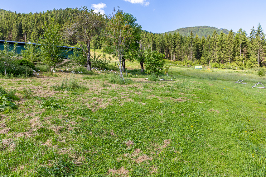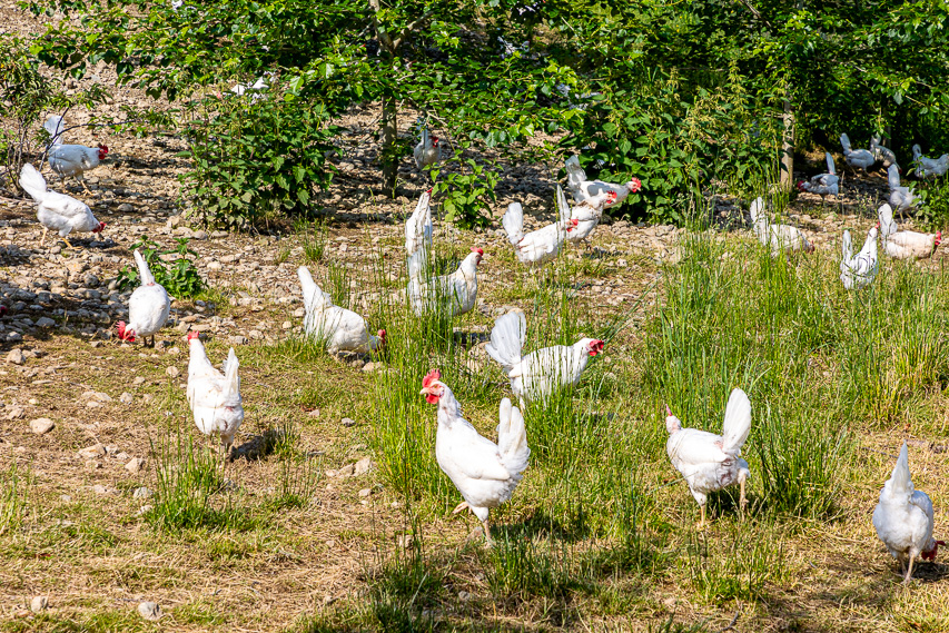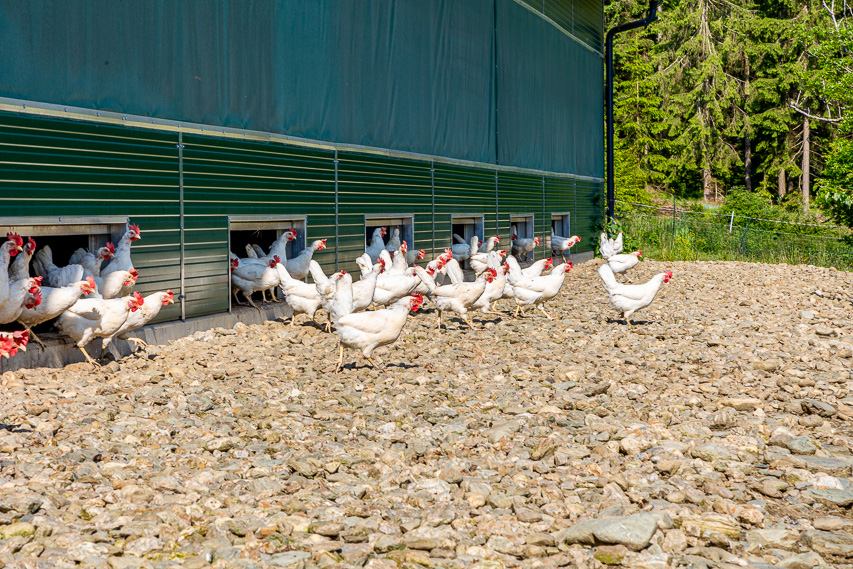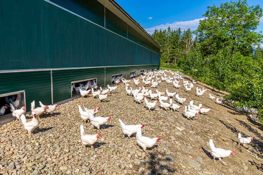 Sobald sich die Tore des modernen und artgerechten Hühnerstalls von der Gensauer Bio-Ei Familie Dieter, Isabell und Sohn Alexander Obereder öffnen, strömen über 6.000 Hühner auf die grüne, saftige und vor allem weitläufige Wiese, auf der sich auch Bäume und Sträucher befinden.