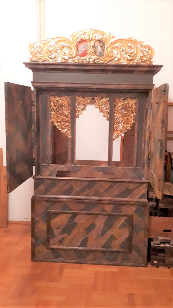 Der Gailtaler Pfarrer Hans-Peter Blümel ist leidenschaftlicher Sammler von Musikinstrumenten und war vor Jahrzehnten als Kaplan in Feldkirchen tätig. „Wir sind seit dieser Zeit befreundet und in Kontakt geblieben. Hans-Peter weiß, dass ich Orgel spiele, weshalb er mich auf diese spezielle Orgel in seiner Sammlung angesprochen hat“, so Alois Gaggl, Chorleiter und Organist in Ossiach und Feldkirchen. Diese Orgel ziert das Wappen von Edmund Iblpacher, der von 1682-1725 als Abt in Ossiach tätig war. Der Erbauer dürfte Franz Knoller sein, der auch die Chororgel in Ossiach (aus dem Jahre 1680) fertigte.