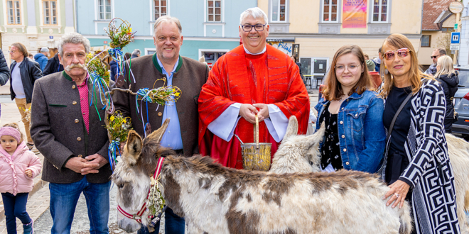Vergangenen Sonntag fand am Hauptplatz von Feldkirchen die heilige Messe samt Palmsegnung statt. Den Gottesdienst zelebrierte Bruder Wolfgang Gracher, dem Oberministrant Otto Hoffmann und Pfarrgemeinderat-Obmann Albert Gaskin helfend zur Seite standen. Musikalisch untermalt wurde die Messe von einem Kinderchor. Sehr zur Freude vieler Kids war auch Bürgermeister Martin Treffner mit zwei Esel aus seiner Zucht mit dabei.