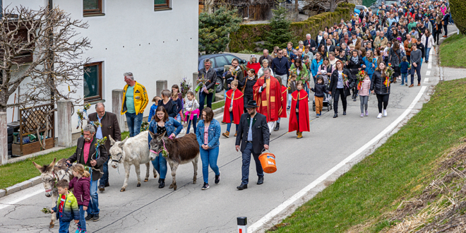 Auch heuer fand die Palmweihe in Glanhofen wieder mit der traditionellen Prozession statt. Gleitet von drei Eseln aus der Zucht von Bürgermeister Martin Treffner.