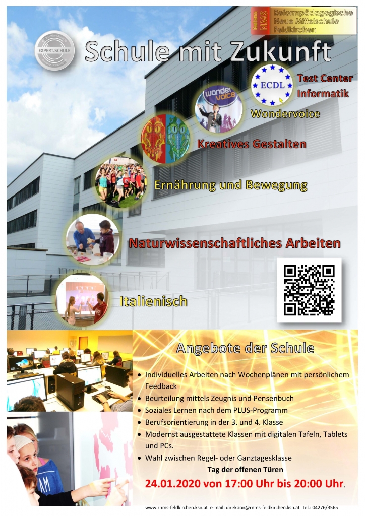 Die reformpädagogische neue Mittelschule Feldkirchen lädt am Freitag, den 24. Jänner 2020 von 17-20 Uhr zum Tag der offenen Türen. Vorgestellt wird das Angebot der Schule, wie unter anderem: individuelles Arbeiten nach Wochenplänen mit persönlichem Feedback, eine Beurteilung mittels Zeugnis und Pensenbuch, soziales Lernen nach dem PLUS-Programm, Berufsorientierung in der 3. und 4. Klasse sowie die modernst ausgestatteten Klassen mit digitalen Tafeln, Tablets und PCs. Geboten wird zudem die Wahl zwischen Regel- oder Ganztagesklasse.