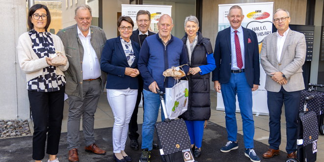 LHStv.in Gaby Schaunig, LR.in Beate Prettner, Tiebelstadt-Bgm. Martin Treffner, Seniorenstadträtin Andrea Pecile, Diakonie-Rektor Hubert Stotter und die beiden LWBK Geschäftsführer Harald Repar und Wolfgang Ruschitzka überreichten Schlüssel an Mieter:innen der neuen Seniorenwohnanlage der Diakonie Waiern im Walter-Domenig-Weg in Feldkirchen.