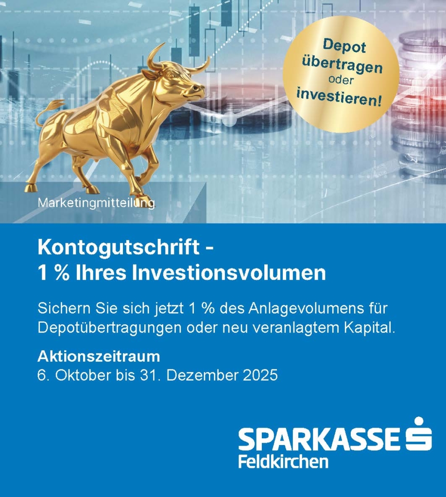 Wer jetzt in Wertpapiere investieren oder sein Depot zur Sparkasse Feldkirchen übertragen möchte, erhält 1 % des übertragenen oder neu investierten Volumens als Willkommensbonus! Wir sprachen mit Veranlangungsexperten Martin Tscherne, Bereichsleiter Wertpapiere & Veranlagungen, vom Wertpapier-Team der Sparkasse Feldkirchen über Einstieg, Risiken und Ablauf.