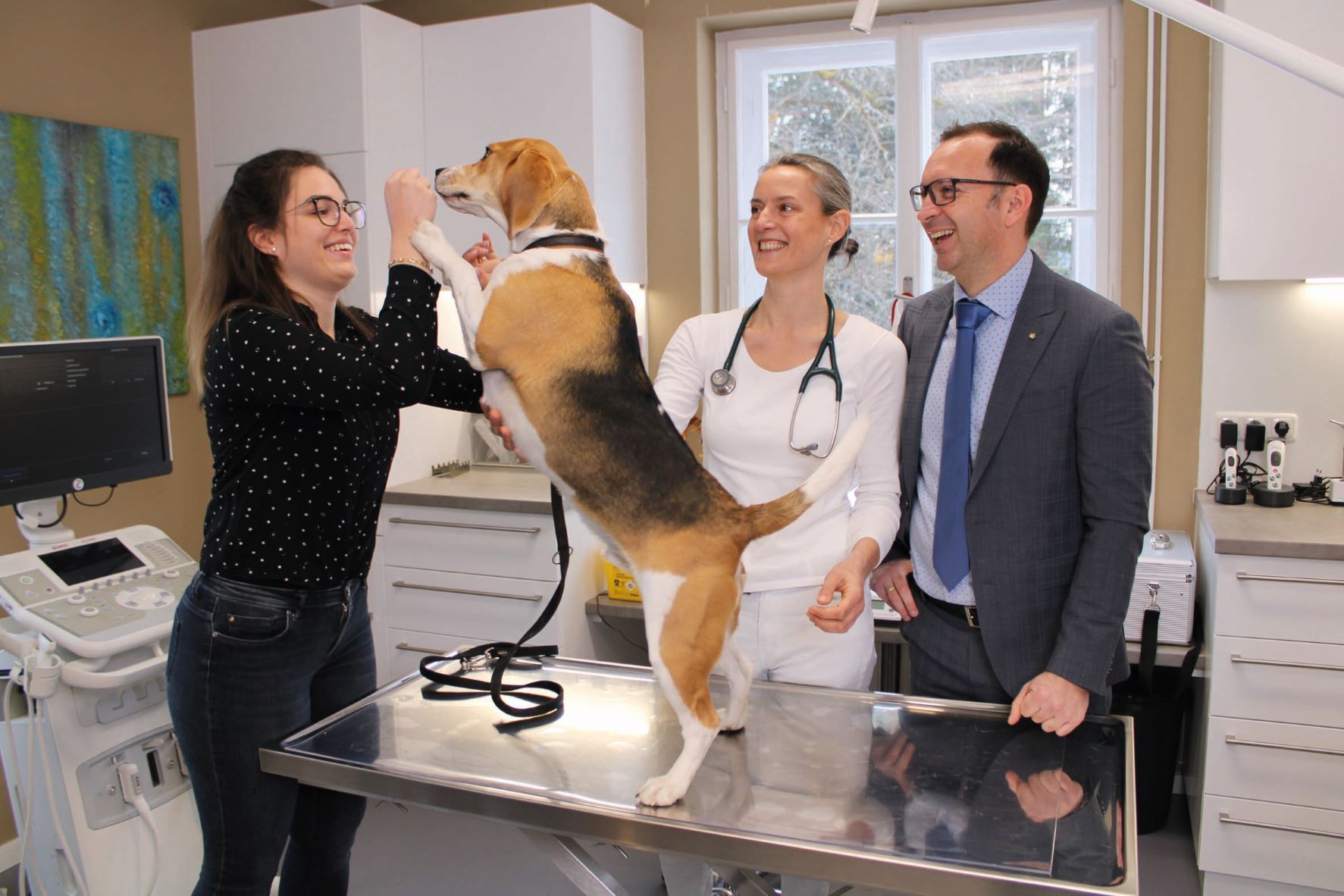 „Charlie“, der tierische Star im Mittelpunkt: Tierärztin Miki Zichy (Mitte), Johanna Glanzer und Michael Greier (beide Sparkasse Feldkirchen) Foto: Sparkasse Feldkirchen