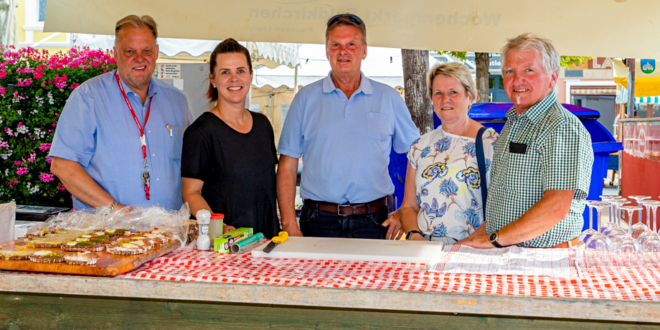 Das 42. Feldkirchner Stadtfest fand heuer am 22. und 23. Juli am Feldkirchner Hauptplatz statt. Bereits seit über vier Jahrzehnten wird dieses Fest der Vielfalt und Tradition nun schon bestritten. Am Freitag spielte die Feldkirchner Band „Zeitlos“ auf. Den Klängen konnte man bei einem gemütlichen Gläschen Wein von der Weinbar lauschen. Am Samstag wurde dann zum zünftigen Frühschoppen geladen. Wer, wenn nicht die Hauskapelle Avsenik, die Original Oberkrainer, spielten auf! „Eigentlich feierte die Hauskapelle Avsenik heuer ebenfalls ein Jubiläum. Immerhin waren sie bereits das 25. Mal bei uns in Feldkirchen mit dabei!“, freut sich Bgm. Martin Treffner über seine Stamm-Musiker. Neben ihm genossen auch noch StR Andrea Pecile, JVP Obmann Simon Niederbichler u.v.a.m. den musikalischen Start in den Tag im Rahmen des Feldkirchner Wcohenmarktes.