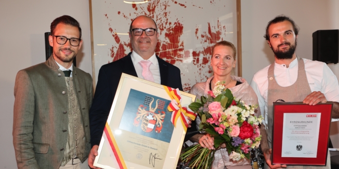 WK-Bezirksstellenobfrau Feldkirchen Eva Hoffmann, WK-Bezirksstellenobmann Villach Bernhard Plasounig und FiW Feldkirchen Brigitte Truppe-Bürger ehrten die Gastgeber-Familie Satran mit Blumen und Ehrenurkunde. Ein besonderer Höhepunkt des Abends war dann aber die Verleihung des Kärntner Landeswappens durch Tourismuslandesrat Sebastian Schuschnig. Eine besondere Auszeichnung und große Ehre, die die außergewöhnlichen Leistungen der Familie Satran und ihres gesamten Teams würdigt. „Die Stiftsschmiede blickt auf eine belebte und bewegte Geschichte zurück. Aus der heimischen Wirtschaft ist sie – Gott sei Dank – nicht mehr wegzudenken. Meine Frau und ich haben hier unseren Bund der Ehe geschlossen“, offenbarte Schuschnig seine emotionale Verbundenheit mit der Stiftsschmiede.