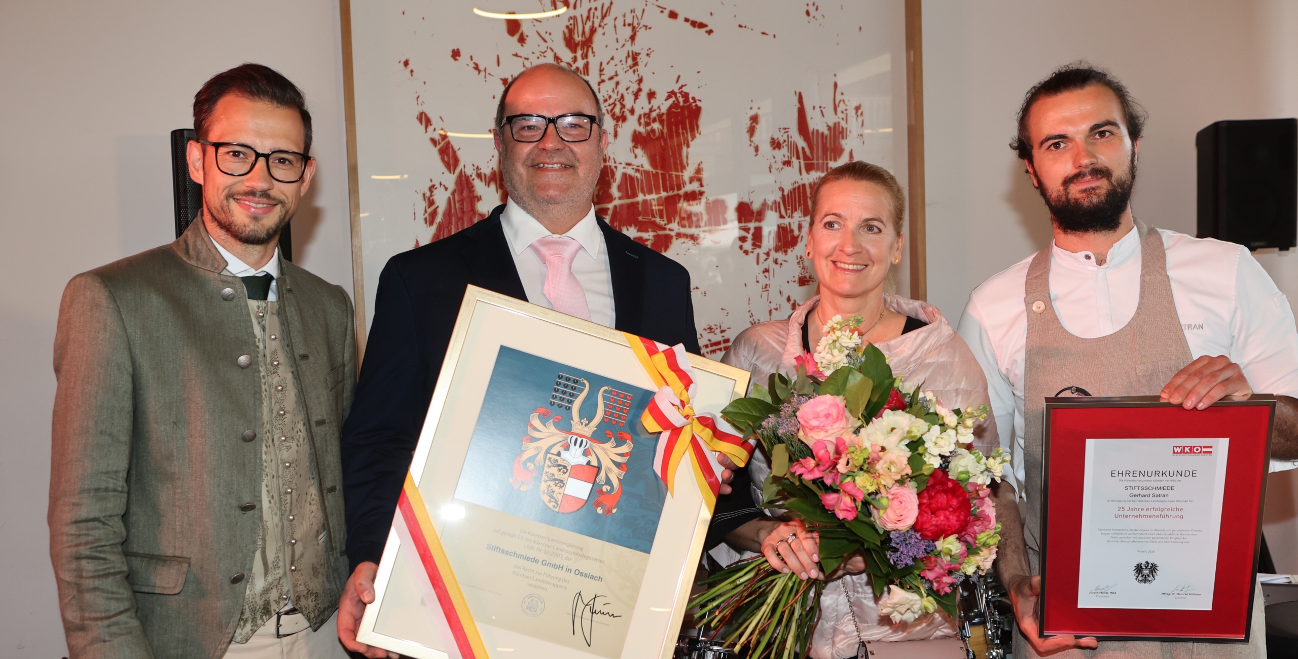 Mit einer festlichen Jubiläumsfeier mit rund 200 geladenen Gästen feierte Familie Satran das 25-jährige Bestehen der Stiftsschmiede – ein Vierteljahrhundert gelebte Leidenschaft, kulinarische Höchstleistungen und beständiger Weiterentwicklung. Das wurde vom Land Kärnten mit der Verleihung des Kärntner Landeswappen entsprechend gewürdigt. Und auch die Wirtschaftskammer Kärnten stellte sich mit Ehrenurkunde und Glückwünschen ein.