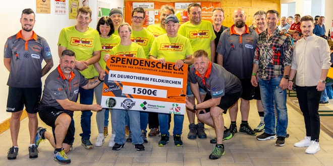 Am 3. Mai ging das große Bezirksderby in der Stocksporthalle in Oberglan über die Bühne. Der EK Deurotherm Feldkirchen besiegte den EV Rottendorf mit 6 : 4. Doch das wir nicht der einzige Grund zum Strahlen! Im Rahmen des sportlichen Ereignisses überreichte das Team des EK Deurotherm Feldkirchen mit Obmann Horst Collino auch einen Spendenscheck in der Höhe von 1.500 Euro an die Stocksportler:innen der Diakonie Waiern mit Betreuer Andi Reimann. „Uns ist aufgefallen, dass die Mannschaft, die auch bei den Special Olympics mitmachen, mit veraltetem Material trainiert. Das wollten wir ändern! So haben wir Schlüsselanhänger mit unserem EK Deurotherm Feldkirchen Logo anfertigen lassen und schon vor und während des Derbys, dem über 300 Zuschauer:innen beiwohnten, verkauft“, erklärt Mannschaftssprecher Alfons Marktl. Die 1.500 Euro werden bei Stocksport Widmann und der Firma Seiwald genutzt. „Wir haben auch schon gemeinsam mit den Special Olympics Athlet:innen in Oberglan trainiert“, freuen sich die Staatsligisten.