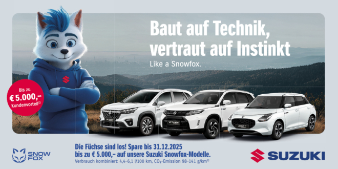 Der Snowfox Bonus im Wert von bis zu 5.000 Euro macht die Anschaffung jetzt besonders günstig. Dabei stehen die drei Modelle S-CROSS, VITARA und SWIFT in verschiedenen Motorisierungen und in individuellen Ausstattungsvarianten zur Verfügung. Allzu lang überlegen sollte man aber nicht, denn die Aktion endet mit 31. Dezember 2025. Und ist auch nicht überall erhältlich. „Wir machen bei der Aktion, die auch einen Händlernachlass beinhaltet mit“, informiert Geschäftsführer Konrad Salmina vom Autohaus Pirker in Feldkirchen und Weitensfeld.