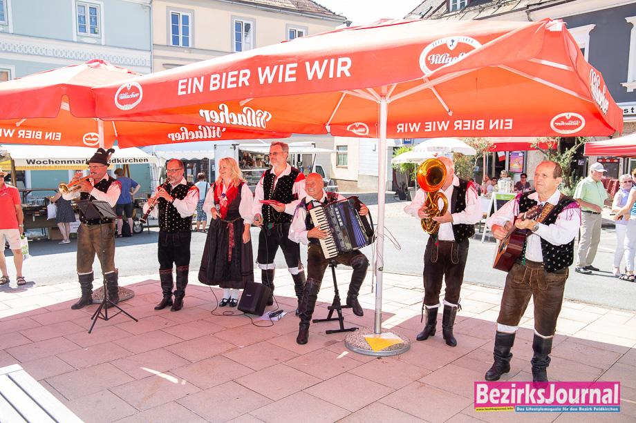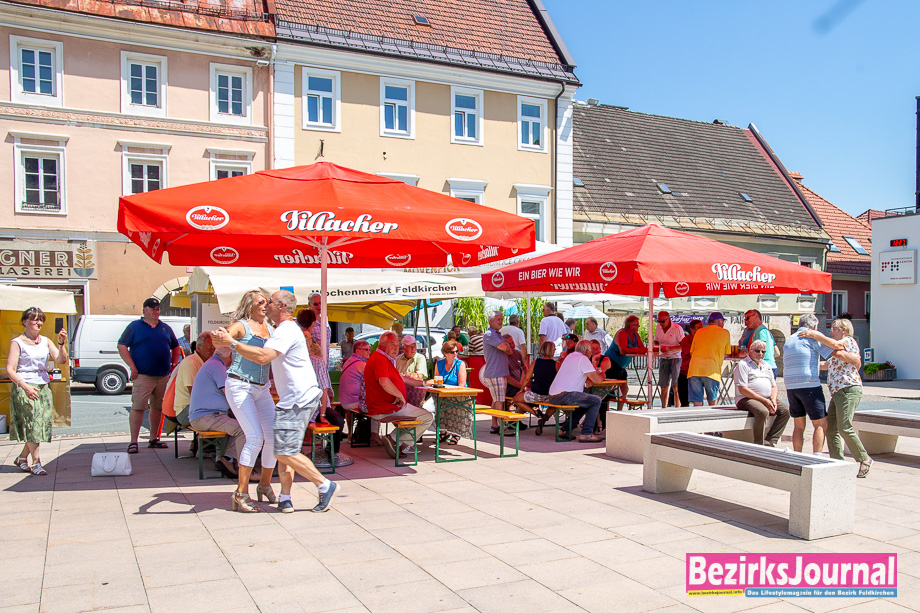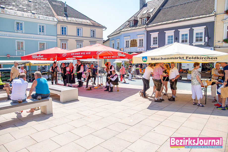 Musik und Gaudi am Wochenmarkt. Einen musikalischen Sommer bietet heuer der beliebte Wochenmarkt in Feldkirchen. Noch bis Ende August spielen jedes Wochenende Musiker und Musikgruppen aller Genres auf. Anfang August spielte die Hauskapelle Avsenik zünftig am Hauptplatz auf, was den einen oder anderen Besucher spontan dazu veranlasste, gekonnt das Tanzbein zu schwingen. Am Samstag, den 22. August, tritt dann die fetzige Schlagerband „Sunnagluat“ auf.