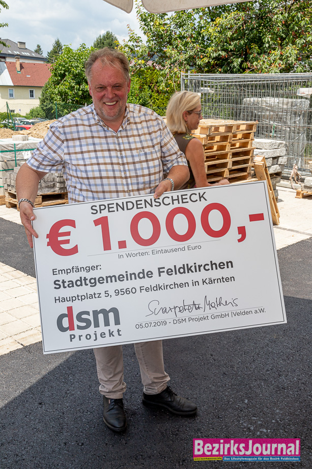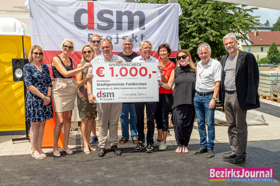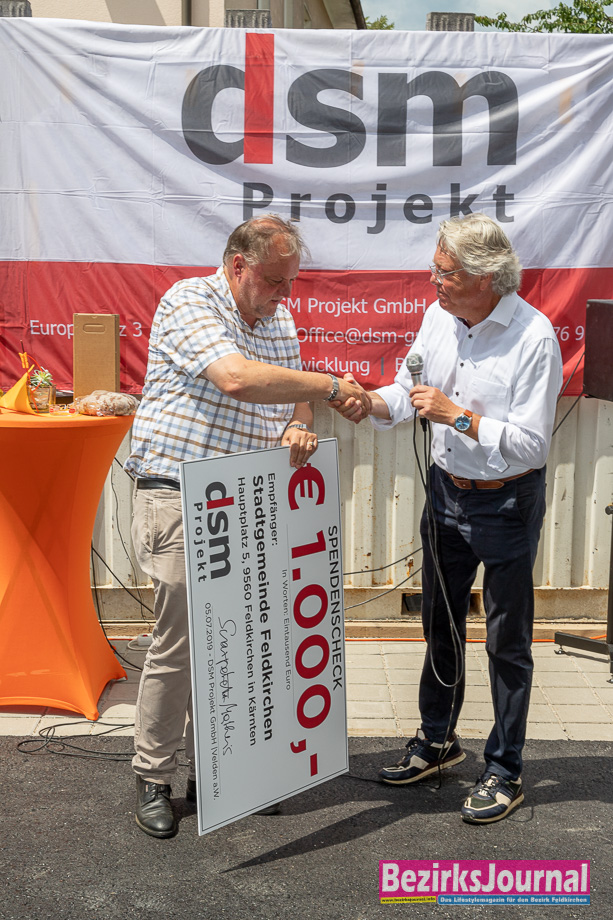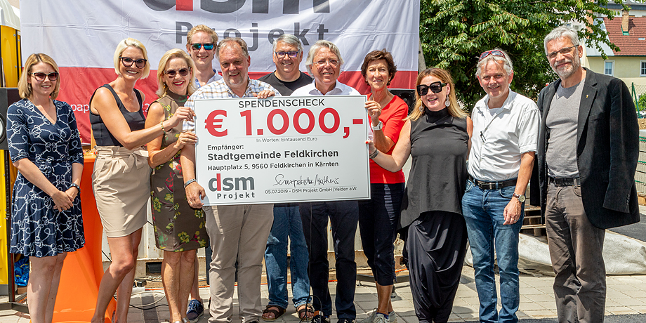 An Bürgermeister Martin Treffner wurde im Zuge der Schlüsselübergabe vom DSM Projekt und Wörthersee Immobilien Team ein Scheck in der Höhe von Euro 1.000,- für soziale Projekt in der Gemeinde übergeben.